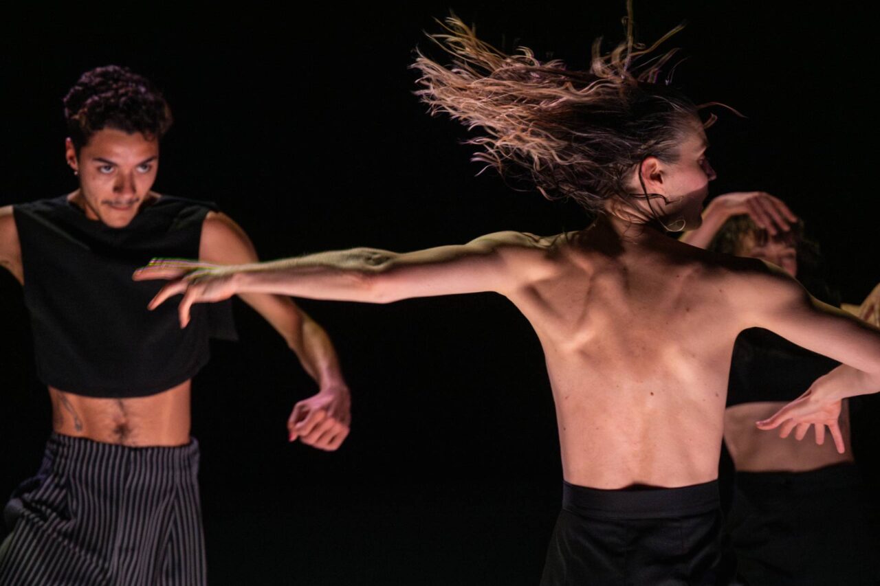 Revival for the Biennale de la danse de Lyon, of this piece created at the same festival in 2012 by Maguy Marin and Denis Mariotte. Crackling sounds of old vinyl, words, stones, different languages, fades to black for brief sequences and flash effects.